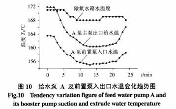 给水泵入口水温见图10、图11,从图中看到,A、B泵前置泵入口水温在前2min基本保持不变,之后以一定斜率下降。A泵入口从163.3℃经11min降为155.0℃,下降速率0.75℃/min;B泵入口从166.3℃经6min降为162.0℃,下降速率0.72℃/min,然后基本保持不变。两者的水温均低于除氧水箱水温,并未出现水温滞后下降的现象。而除氧水箱温度在开始的5min之内保持171.0℃不变,从第6min才开始下降,经4min后降为168.0℃,它的变化速率小于前置泵入口的给水。